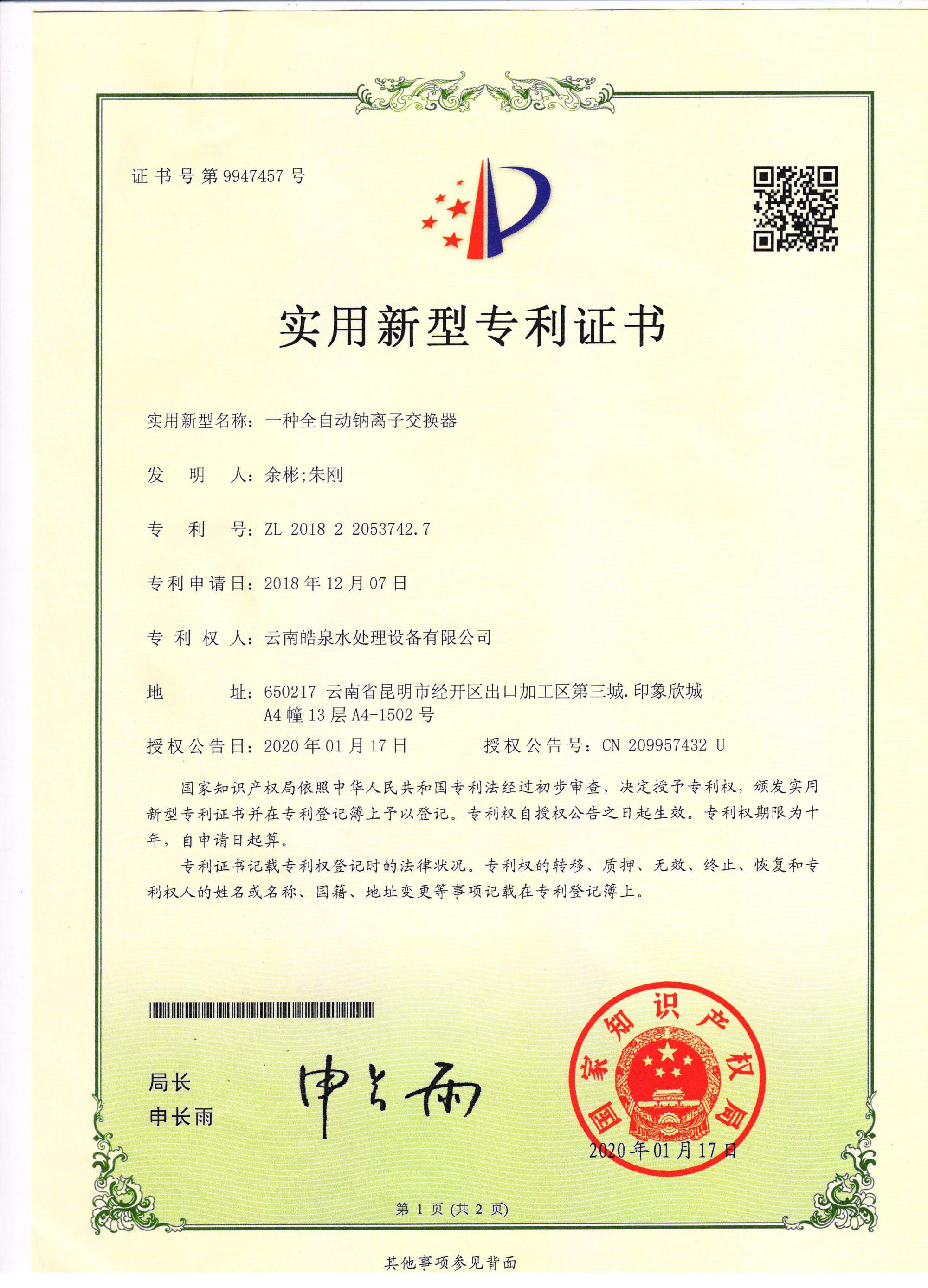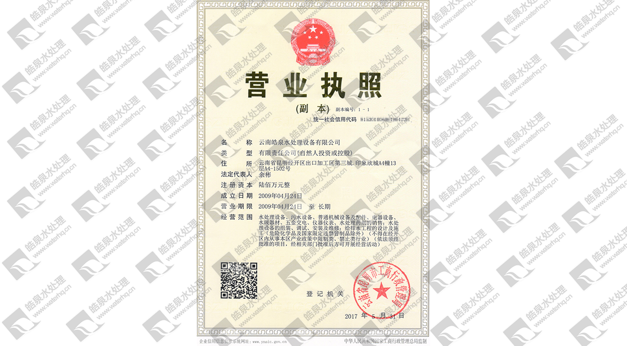 2009年04月: 公司負(fù)責(zé)人 余 彬 和技術(shù)總工 朱 剛 在昆明組建成立 云南皓泉水處理設(shè)備有限公司; 2009年08月: 云南皓泉水處理設(shè)備有限公司在重慶投資參股生產(chǎn)循環(huán)水藥劑; 2009年11月: 云南皓泉水處理設(shè)備有限公司在成都投資參股成立水處理設(shè)備及環(huán)保設(shè)備生產(chǎn)基地; 2010年01月: 云南皓泉水處理設(shè)備有限公司被授予昆明市誠(chéng)信企業(yè); 2010年02月: 云南皓泉水處理設(shè)備有限公司在上海投資參股生產(chǎn)反滲透藥劑; 2011年01月: 云南皓泉水處理設(shè)備有限公司被認(rèn)定授予高新技術(shù)企業(yè); 2017年05月: 云南皓泉水處理設(shè)備有限公司成立官渡分公司; 2017年05月: ----------------------職位描述