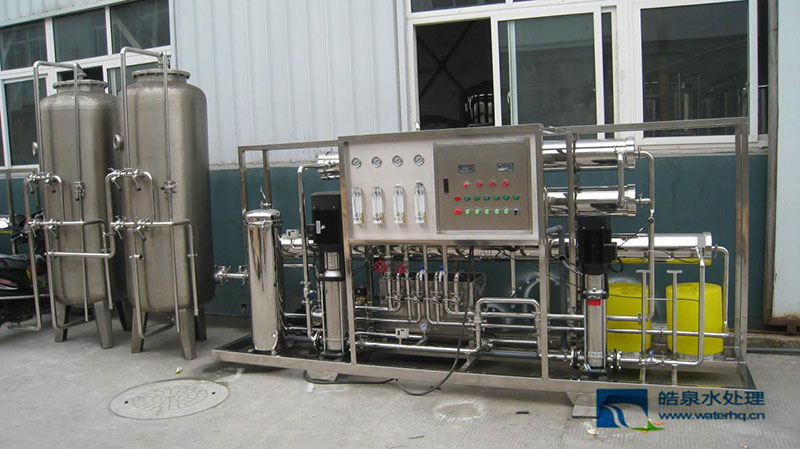 原水-原水加壓泵-多介質(zhì)過濾器-活性炭過濾器-軟水器(或阻垢加藥裝置)-精密過濾器-第一級反滲透-PH調(diào)節(jié)-中間水箱(可選)-第二級反滲透(反滲透膜表面帶正電荷)-純化水箱-純水泵-紫外線殺菌器-微孔過濾器-用水點(diǎn)